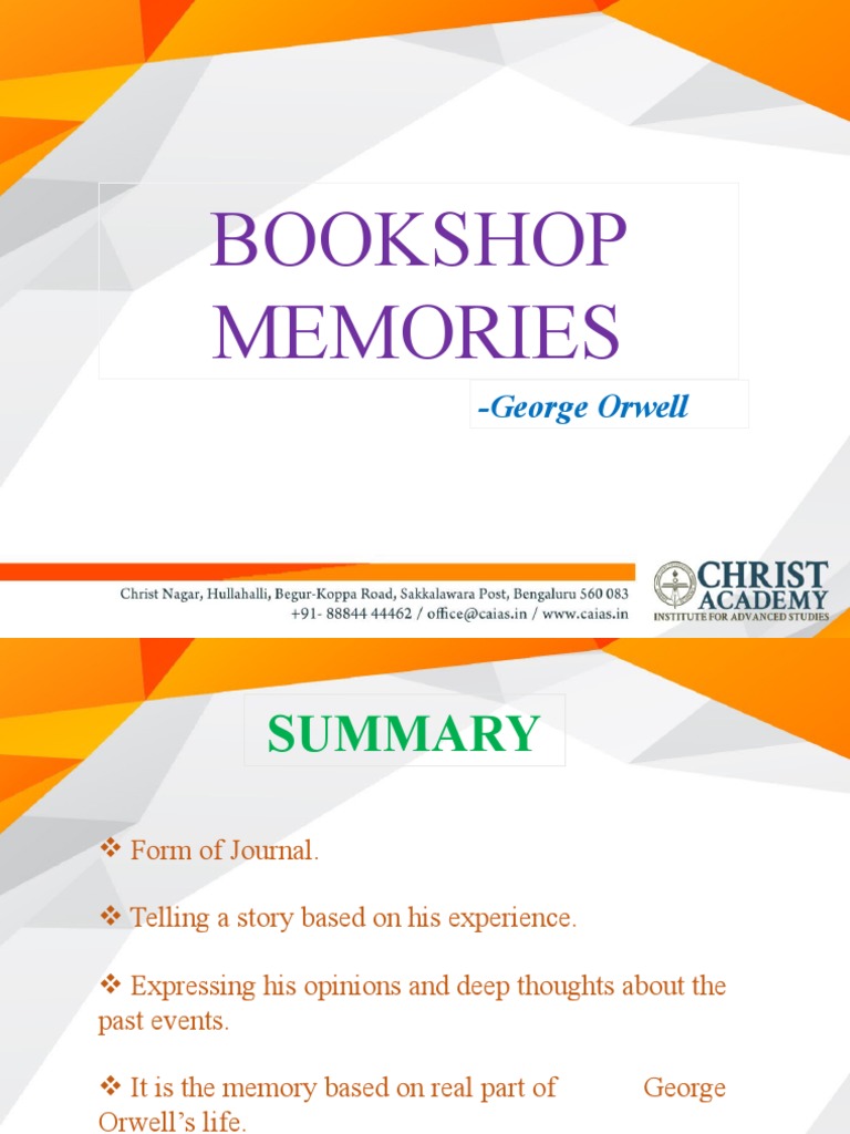 . George Orwells time as a police officer with the Indian Imperial Police in Burma was. Bookshop Memories By George Orwell Aaron Wu 1. George OrwellBookshop Memories.
